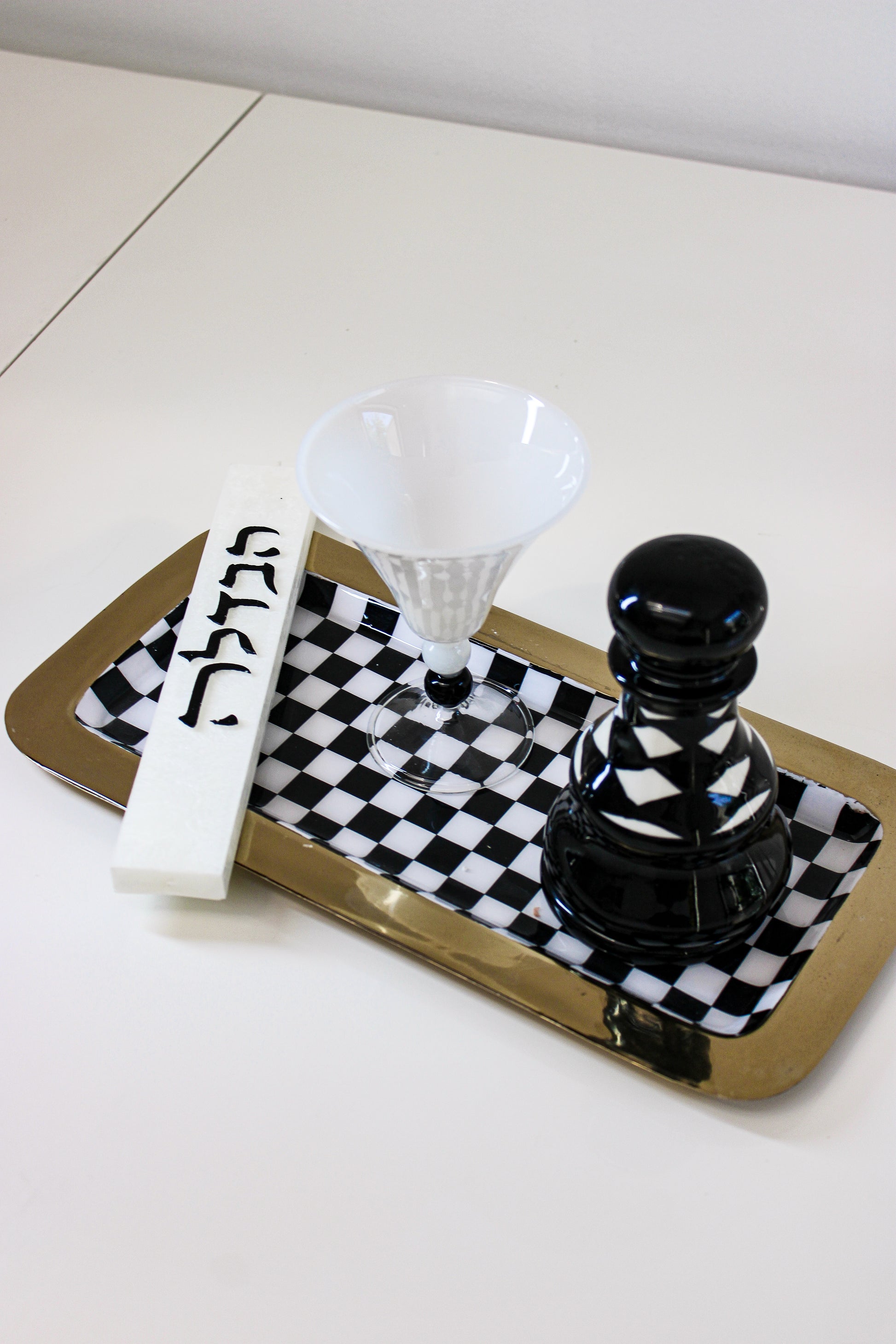 With its graphic checkerboard pattern and refined details, this set brings both meaning and modern elegance to your Shabbat table.
