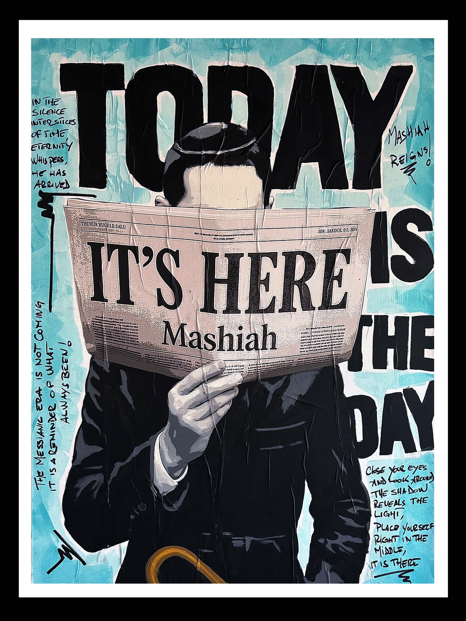 “It’s Here” captures one of the most powerful prophecies of our tradition, the coming of Mashiach , through the playful, disarming lens of contemporary life. In this striking composition, a man reads his morning paper, and the headline simply declares: “It’s Here.” The scene blends irony and revelation, transforming an ordinary moment into a spiritual awakening.